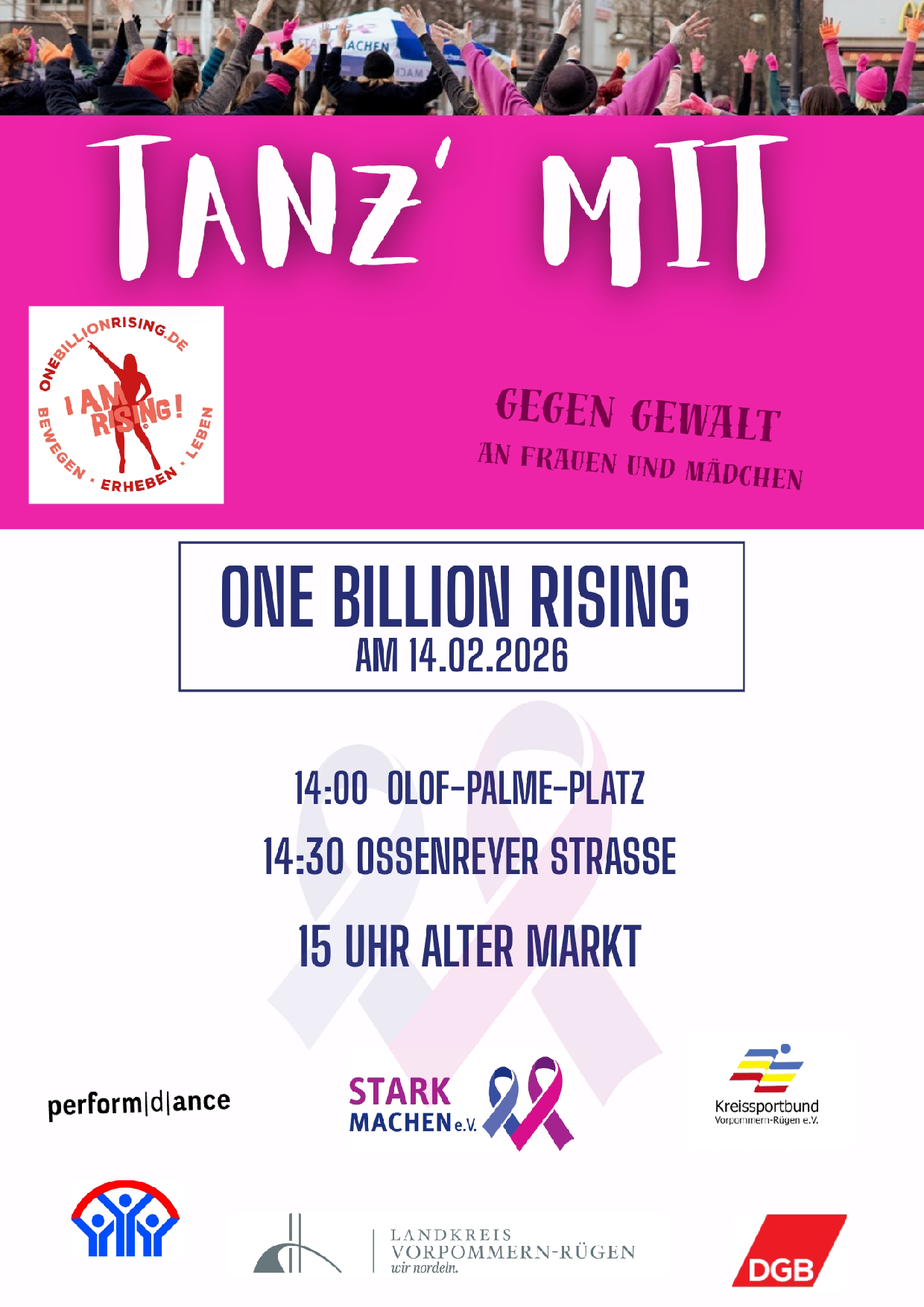Am 14. Februar 2026 beteiligen wir uns gemeinsam mit vielen Engagierten in Stralsund an der weltweiten Tanzaktion One Billion Rising und setzen ein sichtbares Zeichen gegen Gewalt an Frauen und Mädchen.