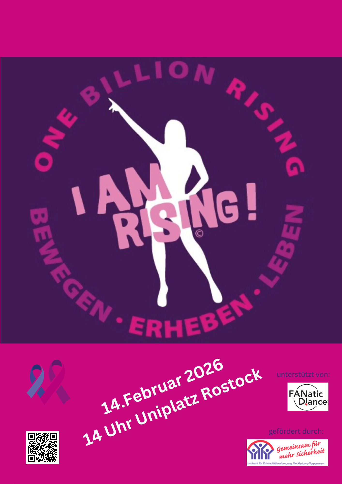 Am 14. Februar 2026 beteiligen wir uns erneut an der weltweiten Tanzaktion One Billion Rising und laden herzlich zur gemeinsamen Aktion auf den Uniplatz in Rostock ein.